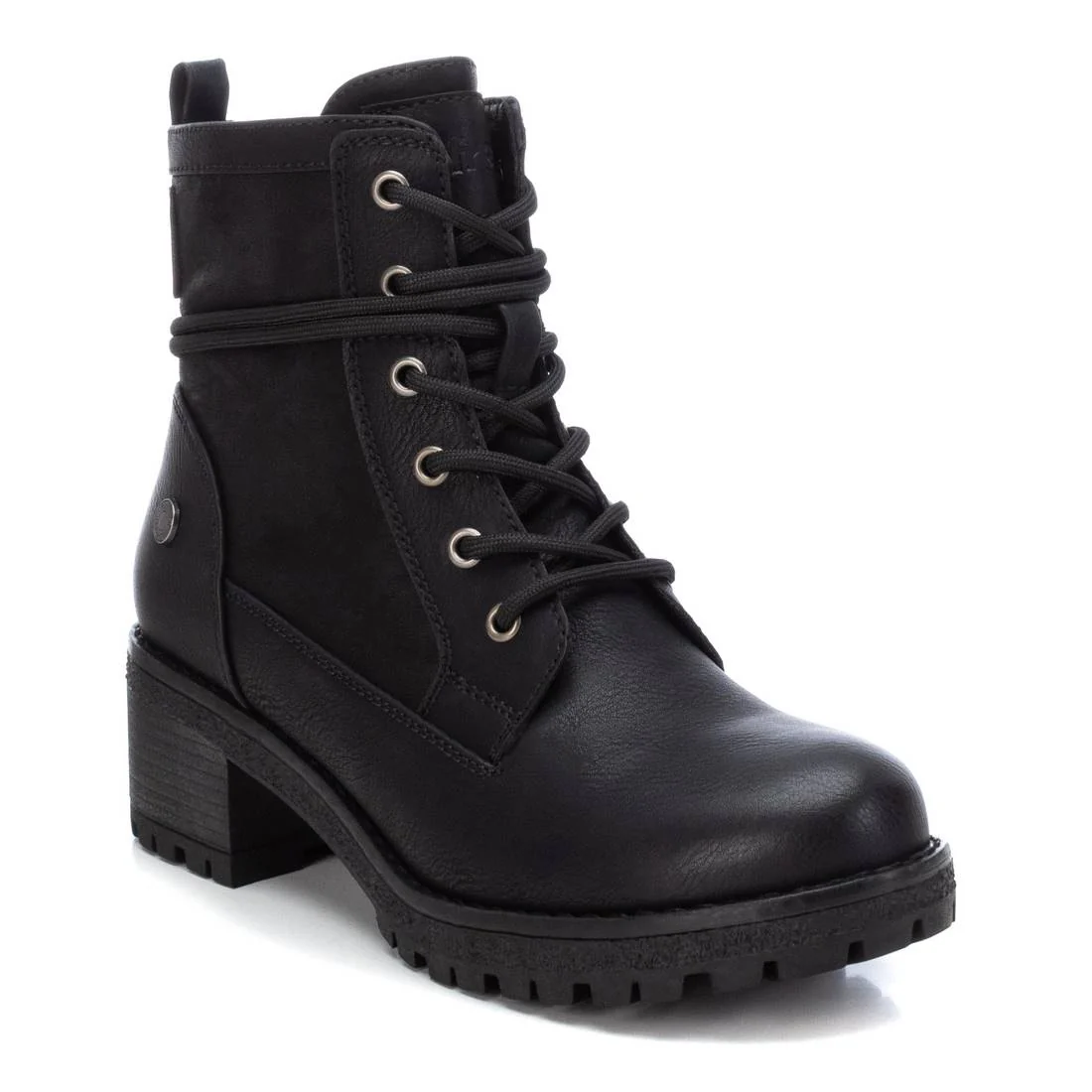 Botín estilo militar de mujer, de la marca Refresh. Fabricado en material que imita la piel. Cremallera lateral y tirador trasero para facilitar la puesta. Ajusta los cordones alrededor del tobillo para darle un toque diferente y en tendencia. Tacón de 5 cm con suela dentada de goma antideslizante. Ideales para un look casual.