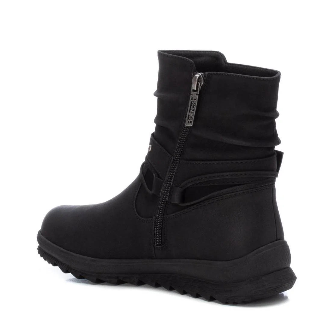 Botín de mujer, de la marca Refresh. Fabricado en material que imita la piel. Cierre mediante cremallera lateral. Correa con hebilla y cintas decorativas. Suela dentada de goma antideslizante. Este modelo ha obtenido el certificado vegano por la organización mundial PETA (Organización de los derechos de los animales).
